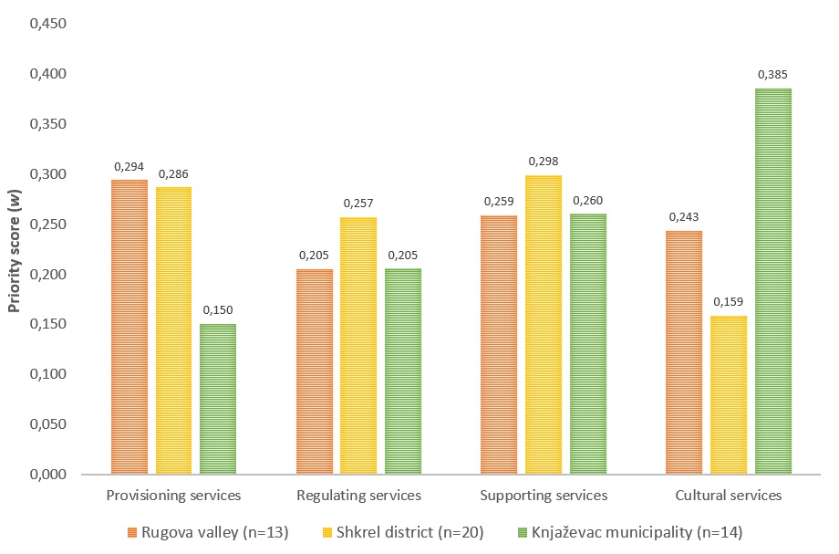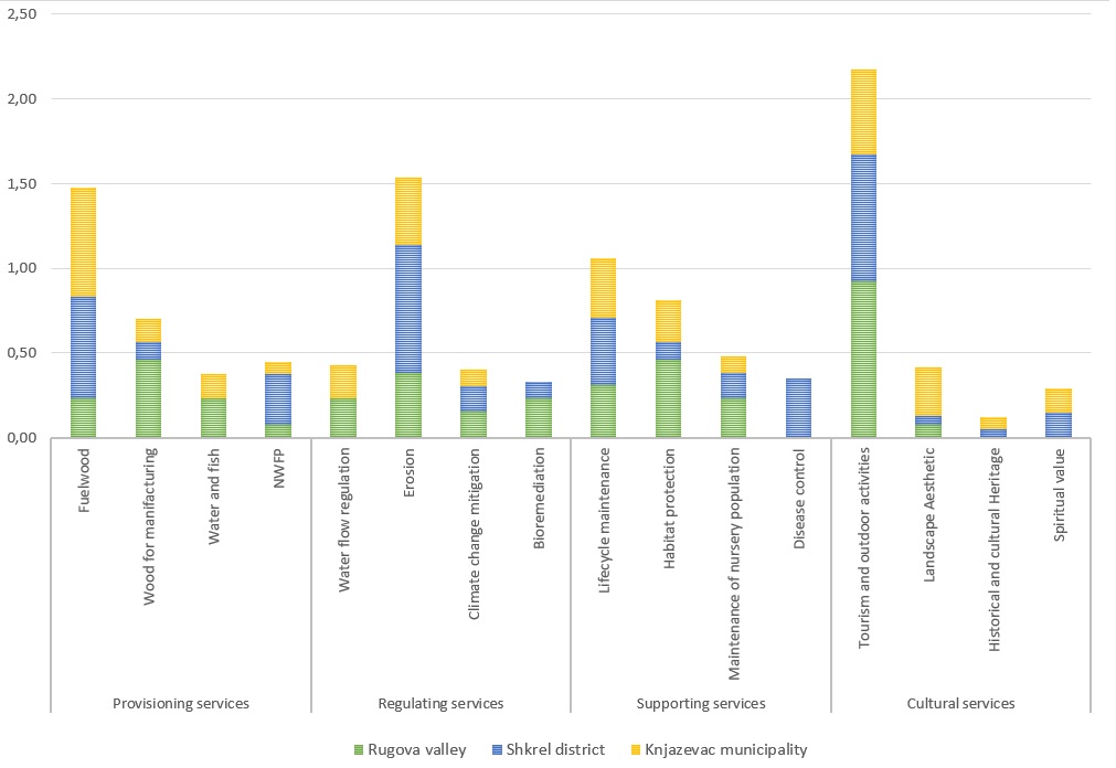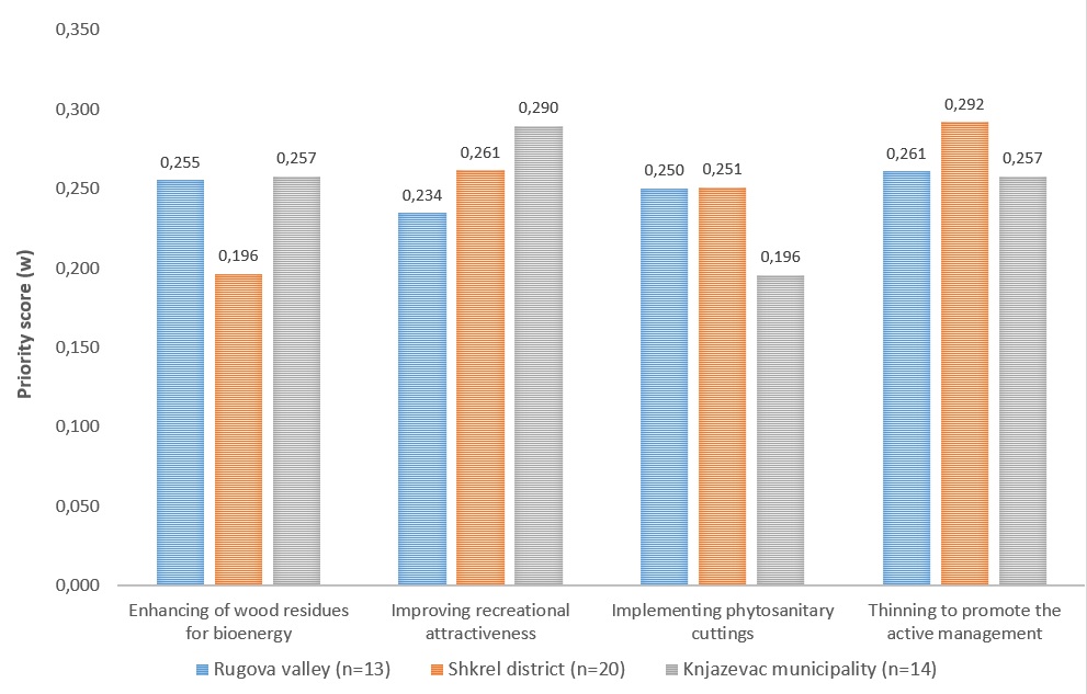 The stakeholders’ involvement in forest management is a key point to facilitate the exchange of information between decision makers and the local community, to reduce conflicts between forest users, and to increase social acceptance of decisions made. The aims of the present study are to identify the stakeholders’ preferences towards ecosystem services provided by forests and to analyze the impacts of forest management practices on ecosystem services in the Balkan region. To achieve these aims a face-to-face survey was conducted in three study areas in the Balkans: Shkrel district in Albania; Rugova valley in Kosovo; Knjazevac municipality in Serbia. The three study areas are in a rural context and they are characterized by strong linkages between the local community and natural resources. The questionnaire – provided as a digital application – was administered to a representative sample of stakeholders in each pilot area. The stakeholders were selected among four main groups of interest: public administrations; environmental NGOs, tourism promoters, and private actors of forest-wood chain. The results show that for the Balkan respondents the most important ecosystem services are supporting services (lifecycle maintenance, habitats protection), followed by provisioning services (wood for manufacturing, fuelwood, water supply).