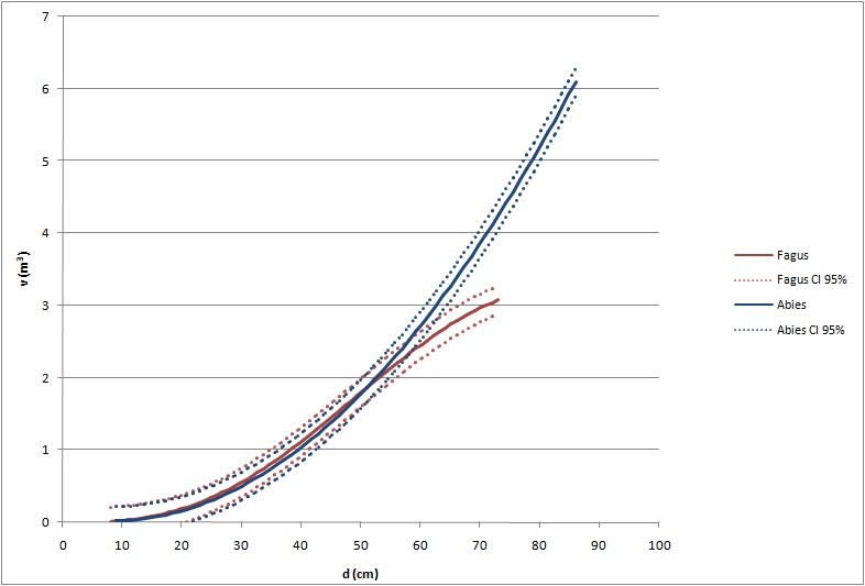 models for the estimation of the A. borisii-regis and F. sylvatica volume fit very well (R2>0.8),