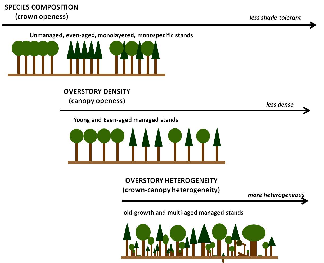 This paper reviews the literature relating to the relationship between light availability in the understory and the main qualitative and quantitative attributes of stand overstory usually considered in forest management and planning (species composition, density, tree sizes, etc.) as well as their changes as consequences of harvesting. The paper is divided in two sections: the first one reviews studies which investigated the influence of species composition on understory light conditions; the second part examines research on the relationships among stand parameters determined from dendrometric field data and the radiation on understory layer. The objective was to highlight which are the most significant stand traits and management features to build more practical models for predicting light regimes in any forest stand and, in more general terms, to support forest managers in planning and designing silvicultural treatments that retain structure in different way in order to meet different objectives.